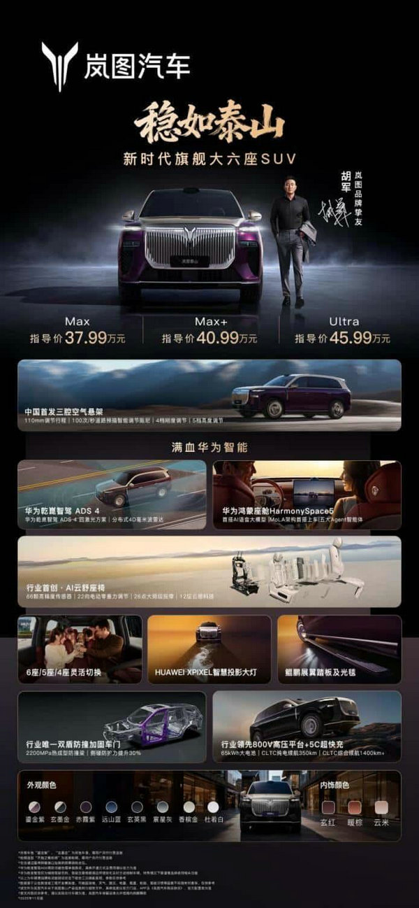 11月18日,嵐圖汽車在深圳國際會展中心召開以“爭峰”為主題的新車發(fā)布會,正式發(fā)布新時代旗艦SUV——嵐圖泰山,新車共推出Max版、Max+版、Ultra版、黑武士版四大版型,官方指導價為37.99萬元-50.99萬元。同時,還公布了總價值4.8萬元的上市權(quán)益。