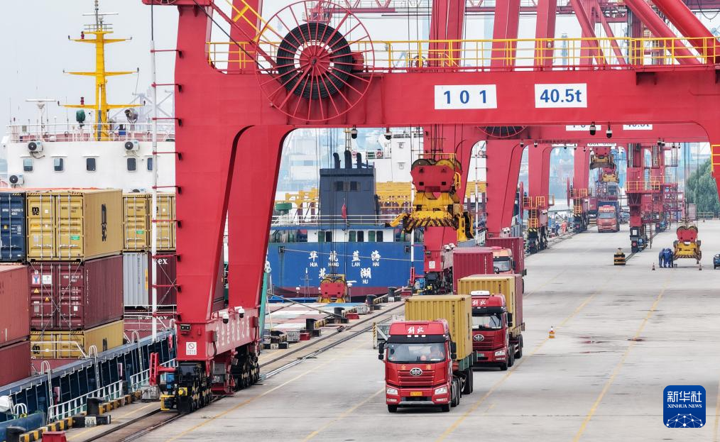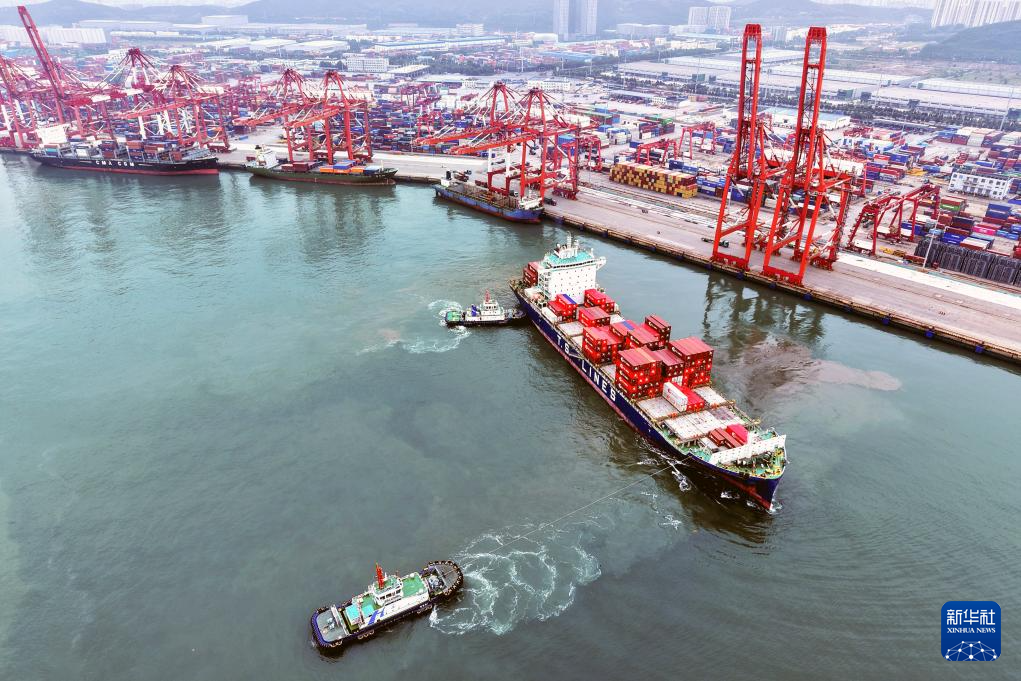 9月8日,在山東港口集團(tuán)青島港,一艘裝載外貿(mào)集裝箱的貨輪駛離泊位(無(wú)人機(jī)照片)。