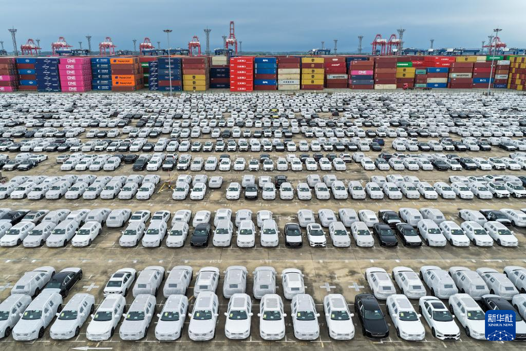 9月8日在江蘇省港口集團(tuán)南京港龍?zhí)陡蹍^(qū)拍攝的準(zhǔn)備裝船出口的汽車(無(wú)人機(jī)照片)。