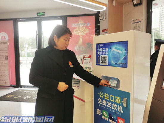 8日下午,在工區(qū)街道躍進(jìn)路50號的綿陽商業(yè)銀行大廳內(nèi),一臺剛剛調(diào)試好,外觀大氣的智能口罩發(fā)放機(jī)擺在記者眼前。銀行的一位工作人員正用微信掃碼準(zhǔn)備取用口罩,掃碼識別公眾號后,柜機(jī)口自動出來一個(gè)一次性防護(hù)口罩,簡單方便,更重要的是全程無接觸??谡滞獍b注明了公益二字。