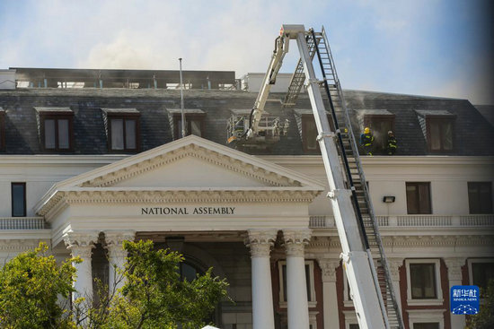 1月2日,消防員在南非開普敦的議會建筑起火現(xiàn)場工作。新華社發(fā)(哈比索·姆卡貝拉 攝)