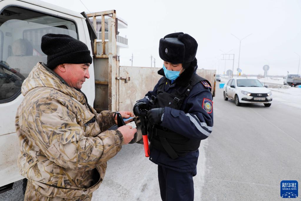 1月7日,哈薩克斯坦執(zhí)法人員在努爾蘇丹的進出城檢查站進行巡查。(新華社發(fā),奧斯潘諾夫攝)