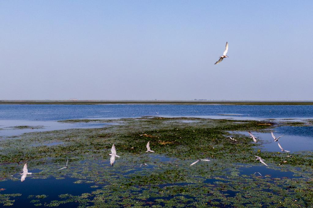 候鳥在湖北省武漢市沉湖生態(tài)自然保護區(qū)水面上飛翔。新華社記者 伍志尊 攝