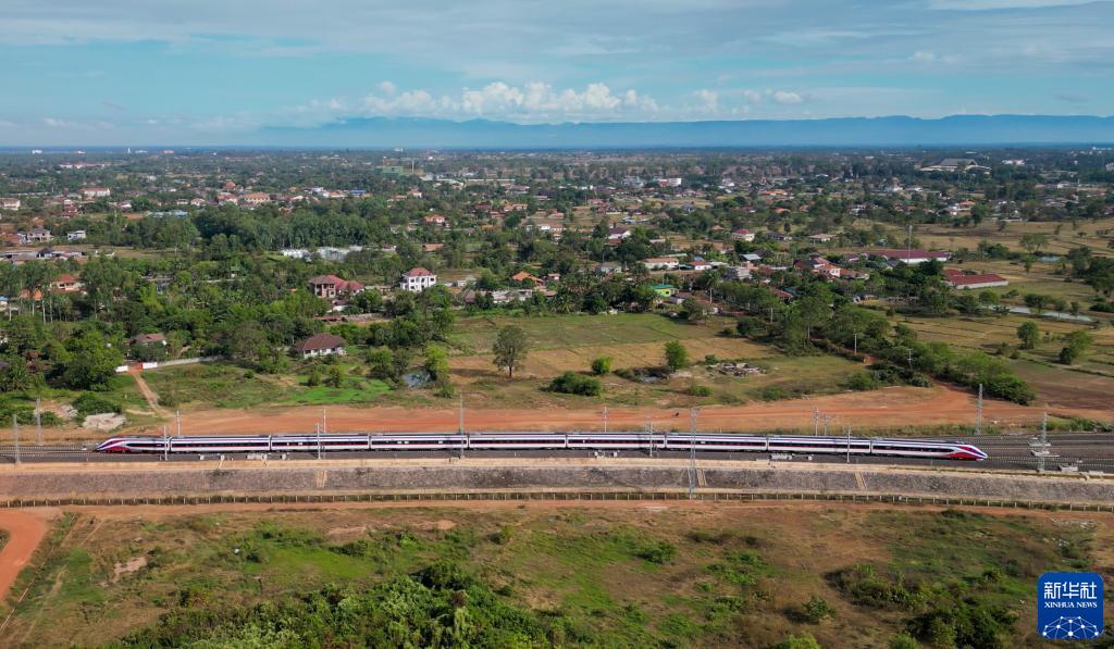 這張11月25日的航拍照片顯示,“瀾滄號”動車組行駛在老撾萬象郊外的中老鐵路老撾段上。新華社發(fā)(凱喬攝)