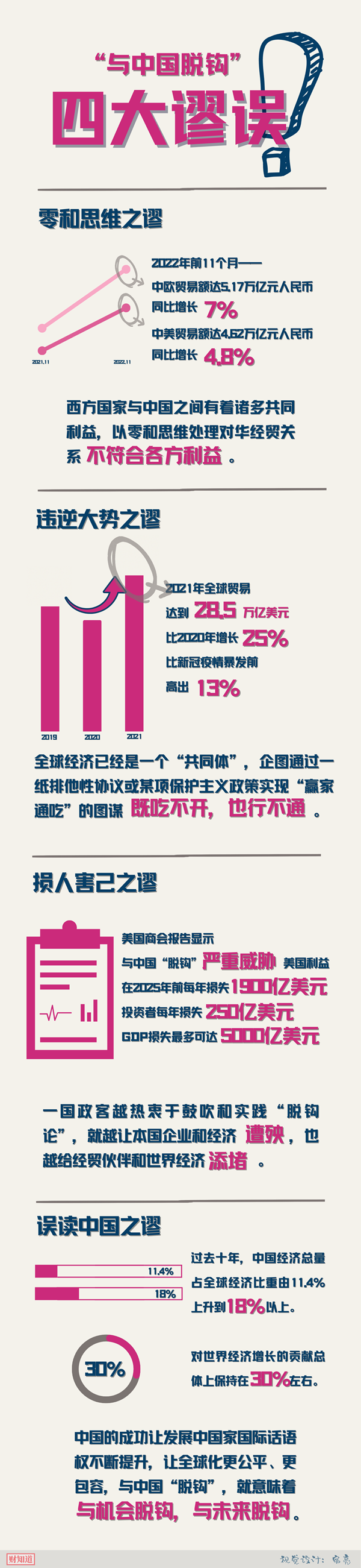 鼓動“與中國脫鉤”時,卻極力矮化中國經(jīng)濟(jì)的全球地位;炒作所謂“中國經(jīng)濟(jì)拖累世界”時,又大談中國經(jīng)濟(jì)的國際影響。這種無法自洽的“脫鉤論”與此前所謂中國經(jīng)濟(jì)“崩潰論”“威脅論”等栽贓話術(shù)一樣,違背經(jīng)濟(jì)規(guī)律,脫離客觀實際,暴露西方一些政客零和思維之謬、違逆大勢之謬、損人害己之謬和誤讀中國之謬。