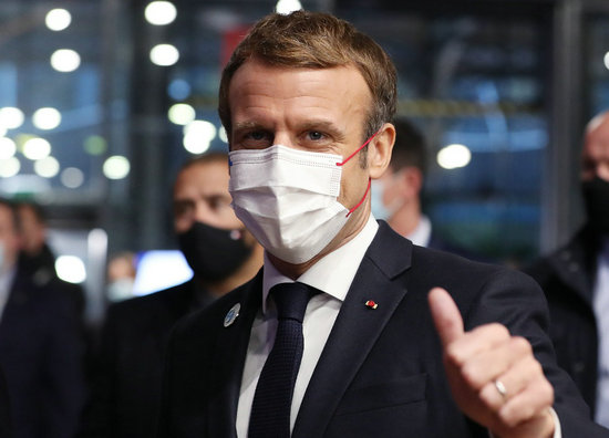 2021年11月11日,在法國巴黎,法國總統(tǒng)馬克龍抵達(dá)巴黎和平論壇會(huì)場。(新華社記者高靜攝)