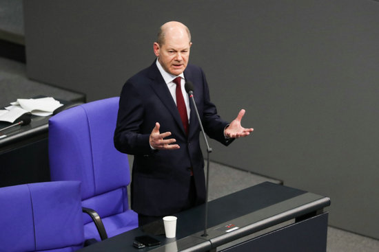 1月12日,德國(guó)總理朔爾茨在位于柏林的德國(guó)聯(lián)邦議會(huì)接受問(wèn)詢(xún)。(新華社記者單宇琦攝)
