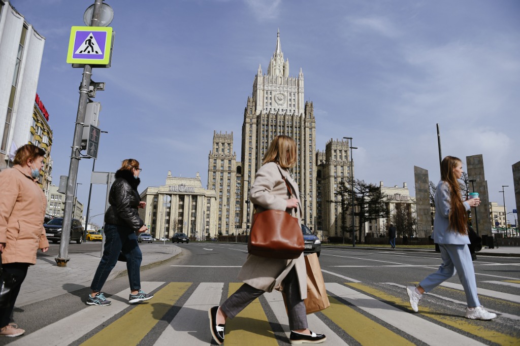 2021年4月16日,在俄羅斯首都莫斯科,行人從俄羅斯外交部大樓附近走過(guò)。(新華社發(fā),葉甫蓋尼·西尼岑攝)