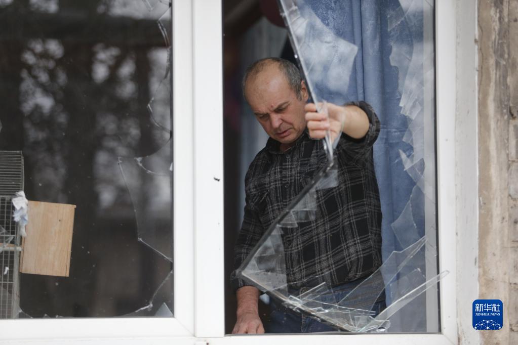 2月24日,頓涅茨克當(dāng)?shù)鼐用癫榭词軗p的房屋。