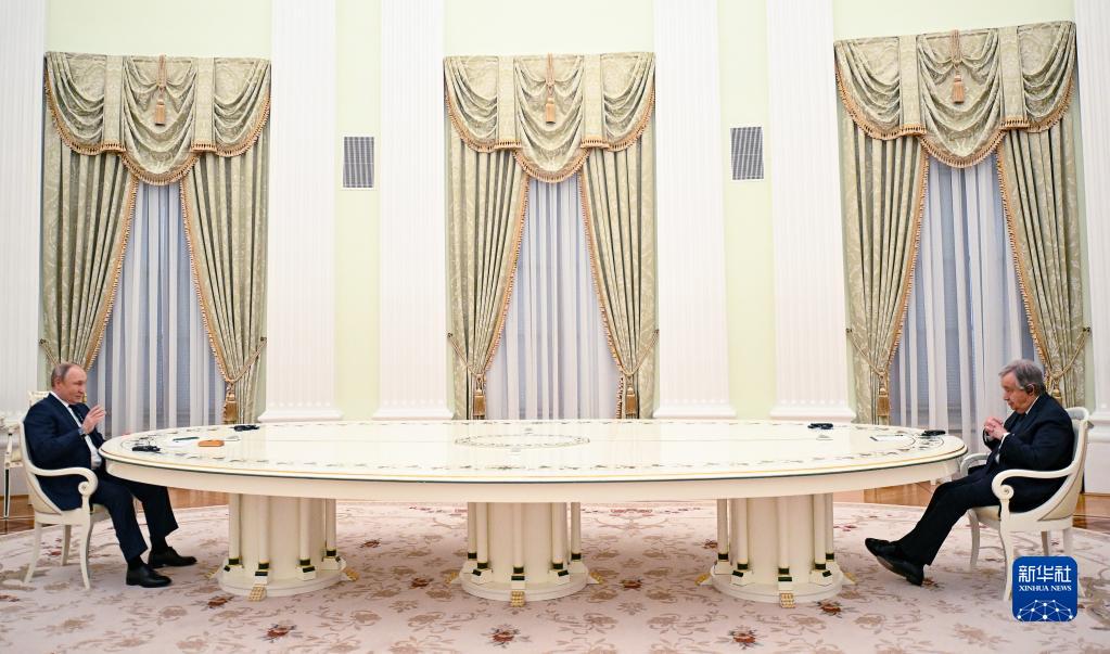 4月26日,俄羅斯總統(tǒng)普京(左)在莫斯科與聯(lián)合國秘書長古特雷斯舉行會談。新華社/塔斯社