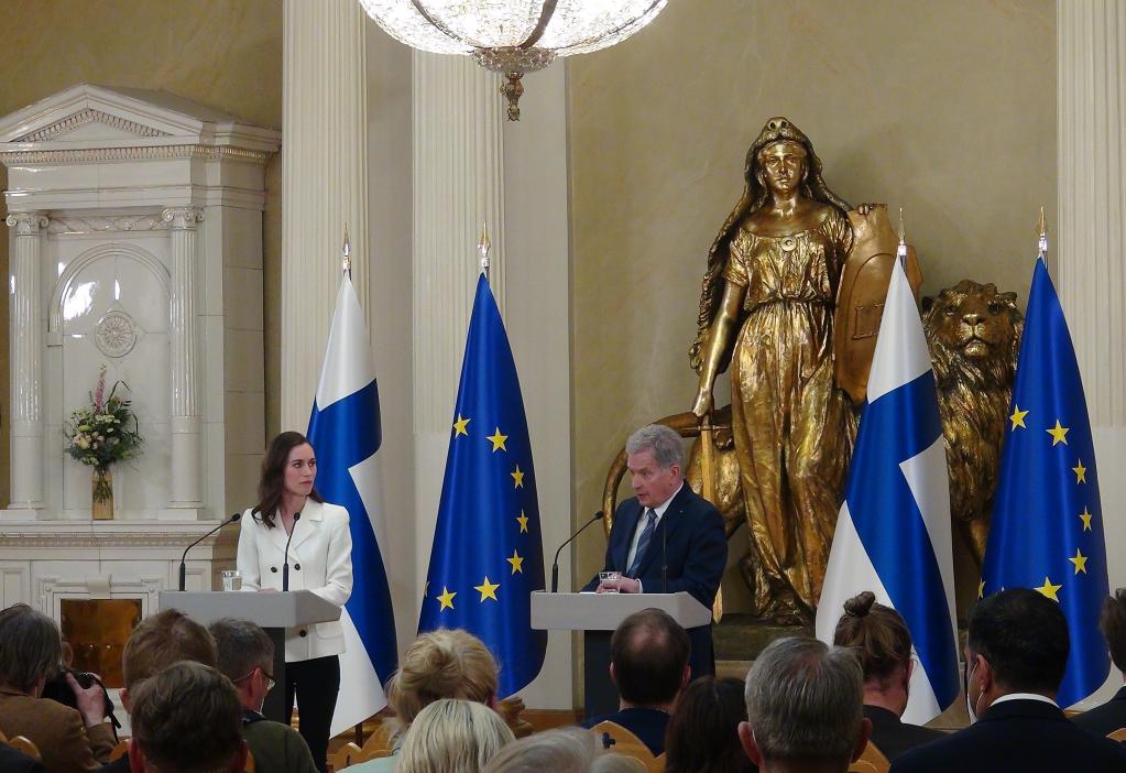5月15日,在芬蘭赫爾辛基,芬蘭總統(tǒng)尼尼斯托(右)和總理馬林舉行聯(lián)合記者會。(新華社記者陳靜攝)