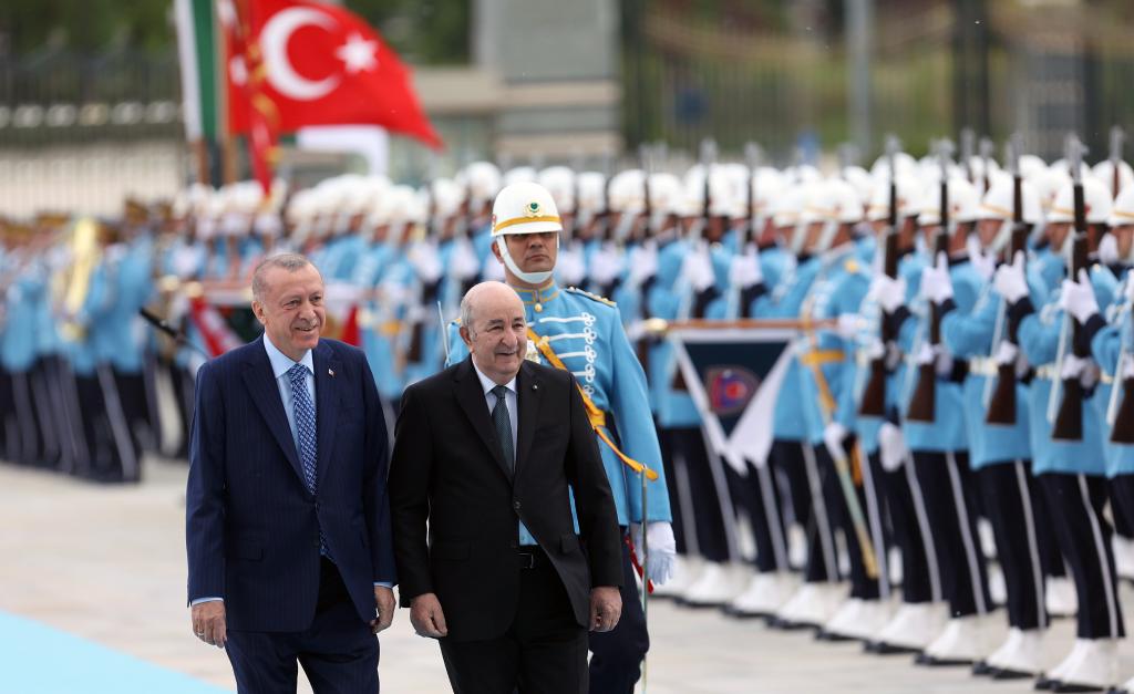 5月16日,在土耳其安卡拉,土耳其總統(tǒng)埃爾多安(左)歡迎到訪的阿爾及利亞總統(tǒng)特本。埃爾多安當(dāng)日表示,土耳其不會同意芬蘭和瑞典加入北約。新華社發(fā)(穆斯塔法·卡亞攝)