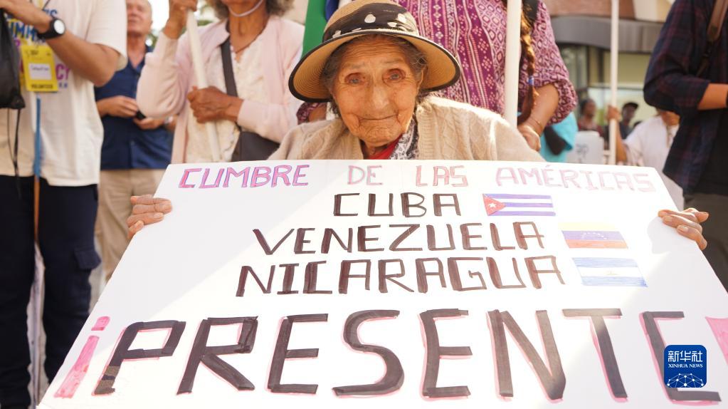 6月10日,在美國加利福尼亞州洛杉磯,一名抗議者手持標語牌參加游行,抗議美國拒絕古巴、尼加拉瓜、委內(nèi)瑞拉三國領導人參加美洲峰會。