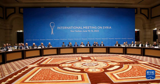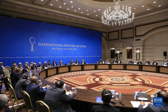 這是6月16日在哈薩克斯坦努爾蘇丹拍攝的第18輪敘利亞問題阿斯塔納會談現(xiàn)場。新華社發(fā)(奧斯潘諾夫 攝)