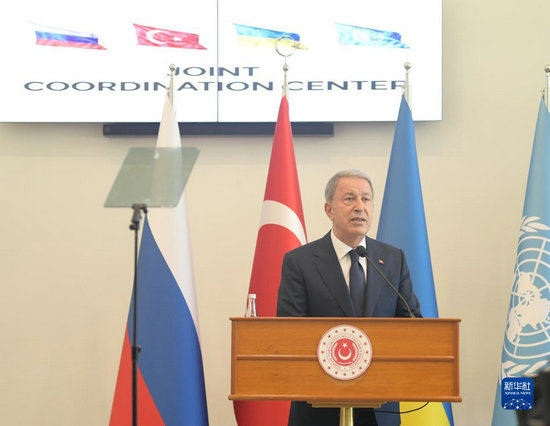 7月27日,在土耳其伊斯坦布爾,土耳其國防部長阿卡爾在黑海糧食外運聯(lián)合協(xié)調中心發(fā)表講話。新華社記者 沙達提 攝