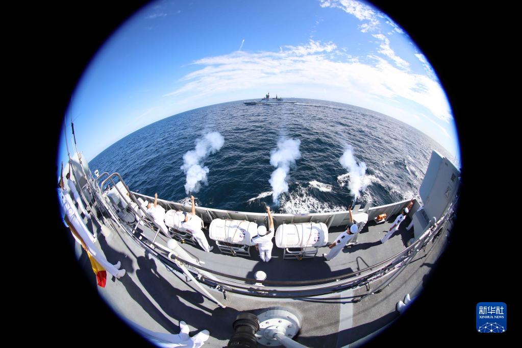 8月20日,“國際軍事比賽-2022”“海洋之杯”比賽在山東青島附近海域閉幕,中俄艦艇在閉幕式結(jié)束后分航。新華社發(fā)(于清正 攝)