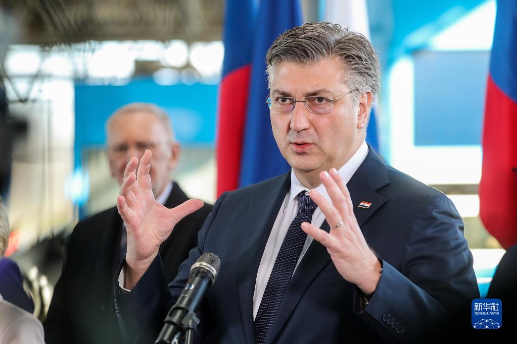 1月1日,在克羅地亞與斯洛文尼亞邊境的布雷加納,克羅地亞總理普連科維奇出席記者會。新華社發(fā)(Pixsell圖片社/盧卡·施坦茨爾攝)