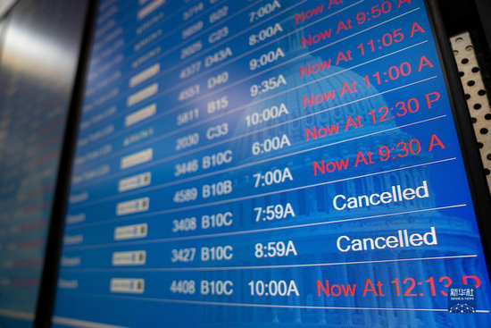 1月11日,在美國弗吉尼亞州阿靈頓的里根國家機場,信息顯示眾多航班延誤或取消。新華社記者 劉杰 攝
