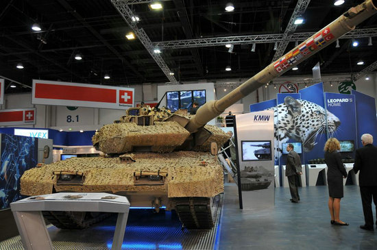 2011年2月21日,在阿聯(lián)酋首都阿布扎比舉行的國際防務(wù)展上拍攝的德國豹2式主戰(zhàn)坦克。(新華社記者安江攝)