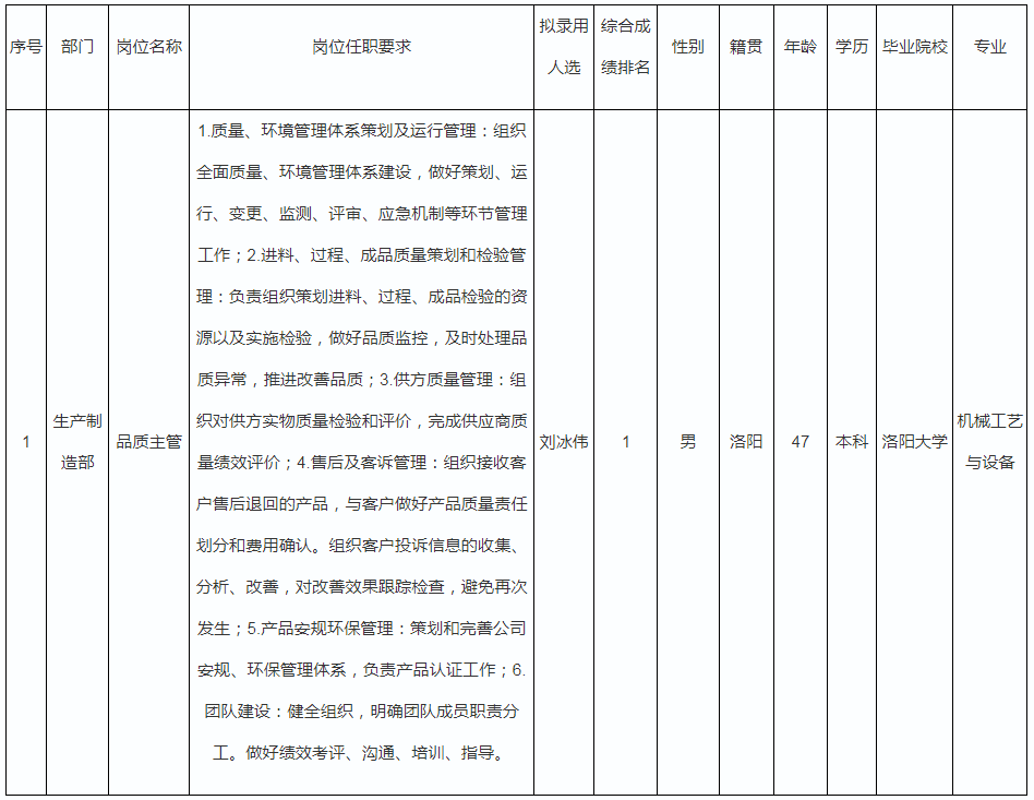 根據(jù)廣東長(zhǎng)虹器件科技有限公司發(fā)布的招聘公告及招聘相關(guān)規(guī)定,經(jīng)筆試、面試、考察、體檢等程序,擬錄用劉冰偉同志到廣東長(zhǎng)虹器件科技有限公司工作,現(xiàn)予以公示,具體情況如下: