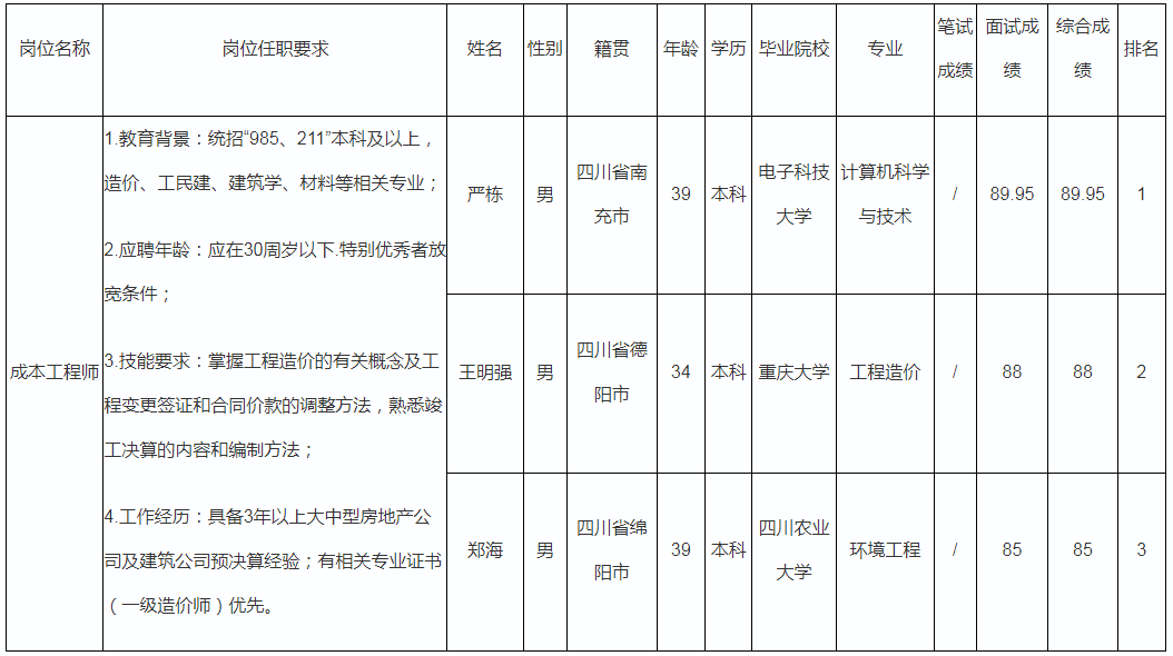 根據(jù)四川波鴻實業(yè)有限公司發(fā)布的招聘公告及招聘相關(guān)規(guī)定,經(jīng)初試、復(fù)試等程序,現(xiàn)將綿陽萬鴻房地產(chǎn)開發(fā)有限公司成本工程師崗位面試成績予以公示。