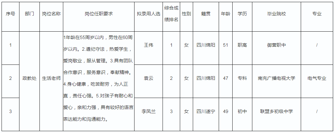 根據(jù)綿陽中學(xué)實(shí)驗(yàn)學(xué)校發(fā)布的招聘公告及招聘相關(guān)規(guī)定,經(jīng)面試、考察、體檢等程序,擬錄用王偉等3名同志到綿陽中學(xué)實(shí)驗(yàn)學(xué)校工作?,F(xiàn)予以公示,具體情況如下: