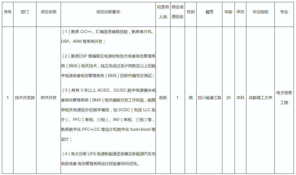 根據四川能創(chuàng)智電科技有限責任公司發(fā)布的招聘公告及招聘相關規(guī)定,經面試、考察、體檢等程序,擬錄用趙躍同志到我司工作,現(xiàn)予以公示,具體情況如下: