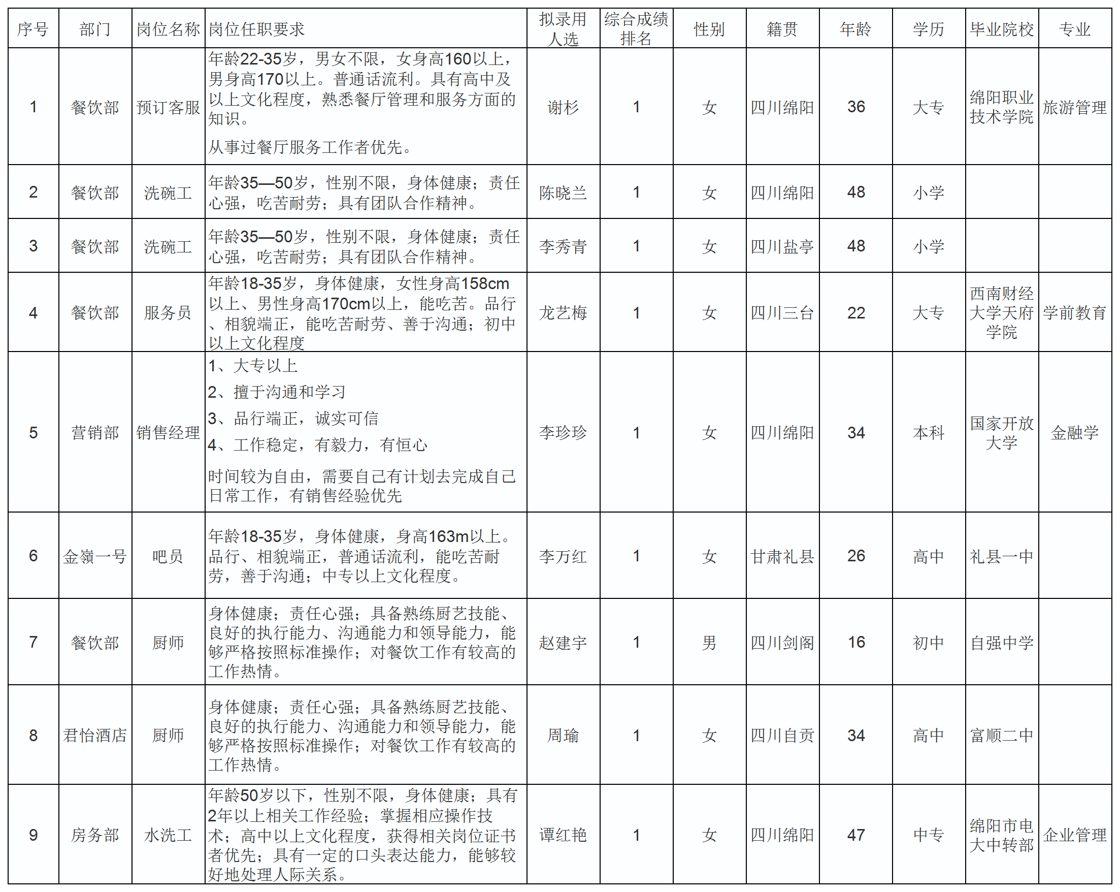 根據(jù)四川長(zhǎng)虹國(guó)際酒店有限責(zé)任公司發(fā)布的招聘公告及招聘相關(guān)規(guī)定,經(jīng)筆試、面試、考察、體檢等程序,擬錄用謝杉等九名同志到長(zhǎng)虹國(guó)際酒店工作,現(xiàn)予以公示,具體情況如下: