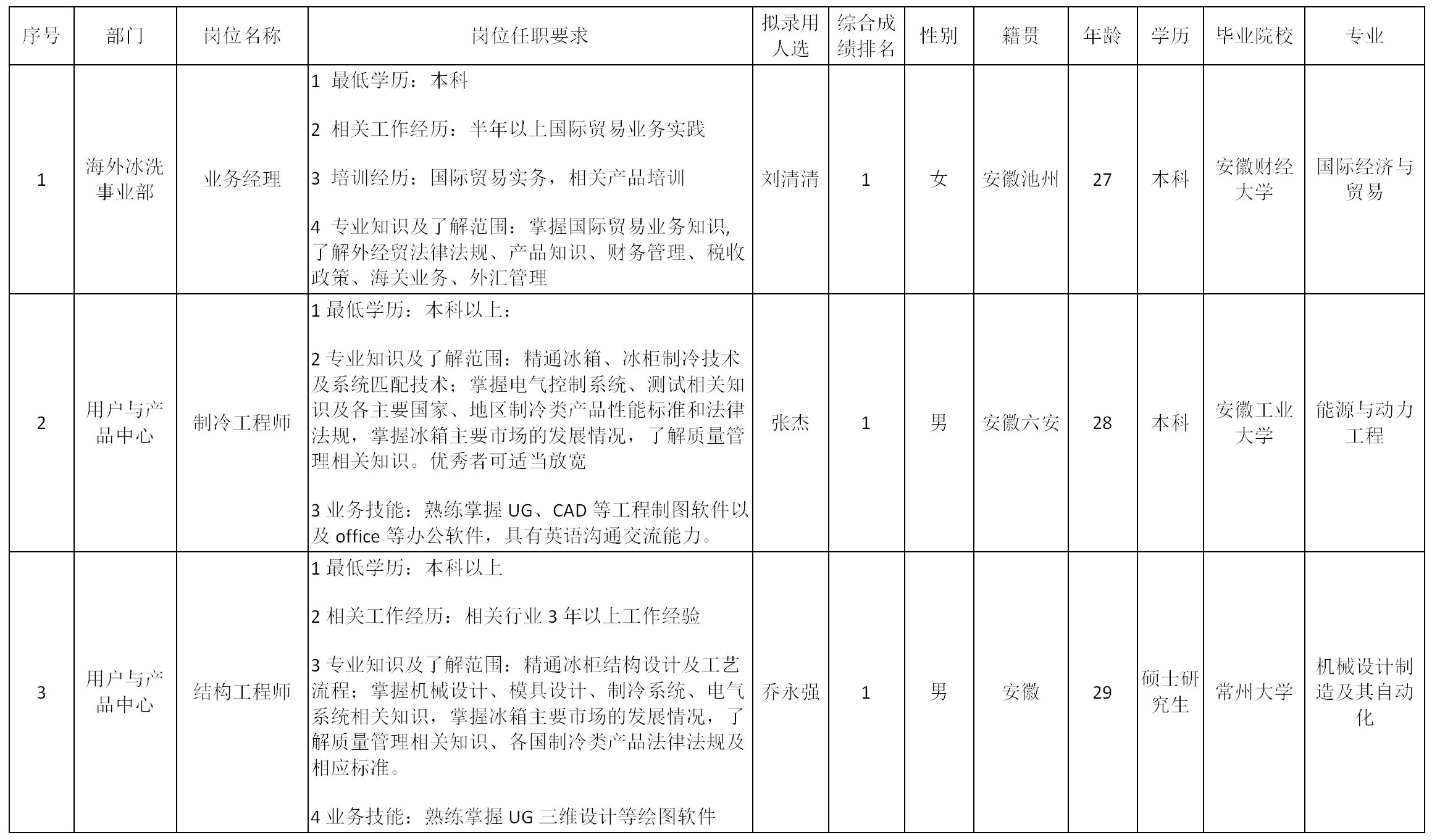 根據(jù)長虹美菱股份有限公司發(fā)布的招聘公告及招聘相關規(guī)定,經(jīng)面試、體檢等程序,擬錄用劉清清同志到海外冰洗事業(yè)部部門工作,現(xiàn)予以公示,具體情況如下: