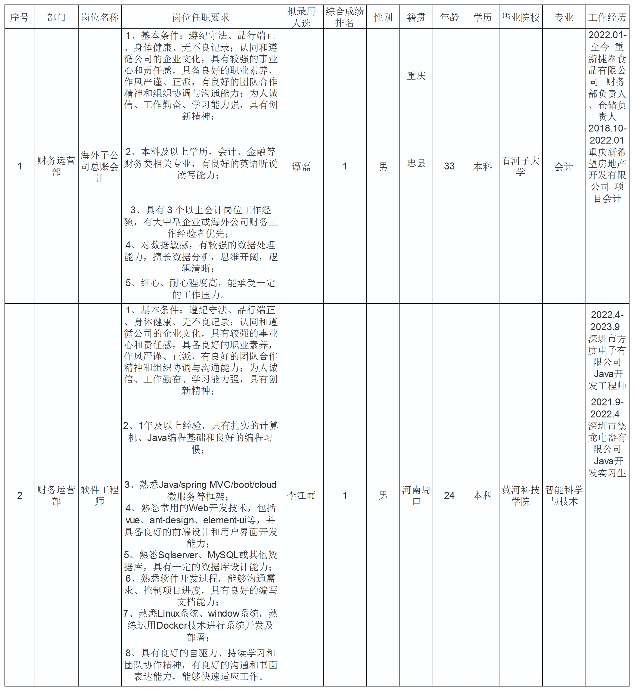 根據(jù)長虹·美菱國際區(qū)品牌運營中心發(fā)布的招聘公告及招聘相關(guān)規(guī)定,經(jīng)面試、考察、體檢等程序,擬錄用譚磊、李江雨同志到財務(wù)運營部工作,現(xiàn)予以公示,具體情況如下: