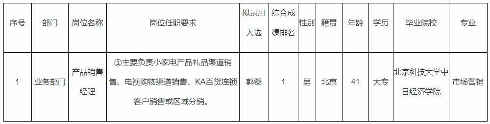 根據(jù)四川長(zhǎng)虹佳華信息產(chǎn)品有限責(zé)任公司發(fā)布的招聘公告及招聘相關(guān)規(guī)定,經(jīng)筆試、面試、考察、體檢等程序,擬錄用郭磊同志到四川長(zhǎng)虹佳華信息產(chǎn)品有限責(zé)任公司工作,現(xiàn)予以公示,具體情況如下:
