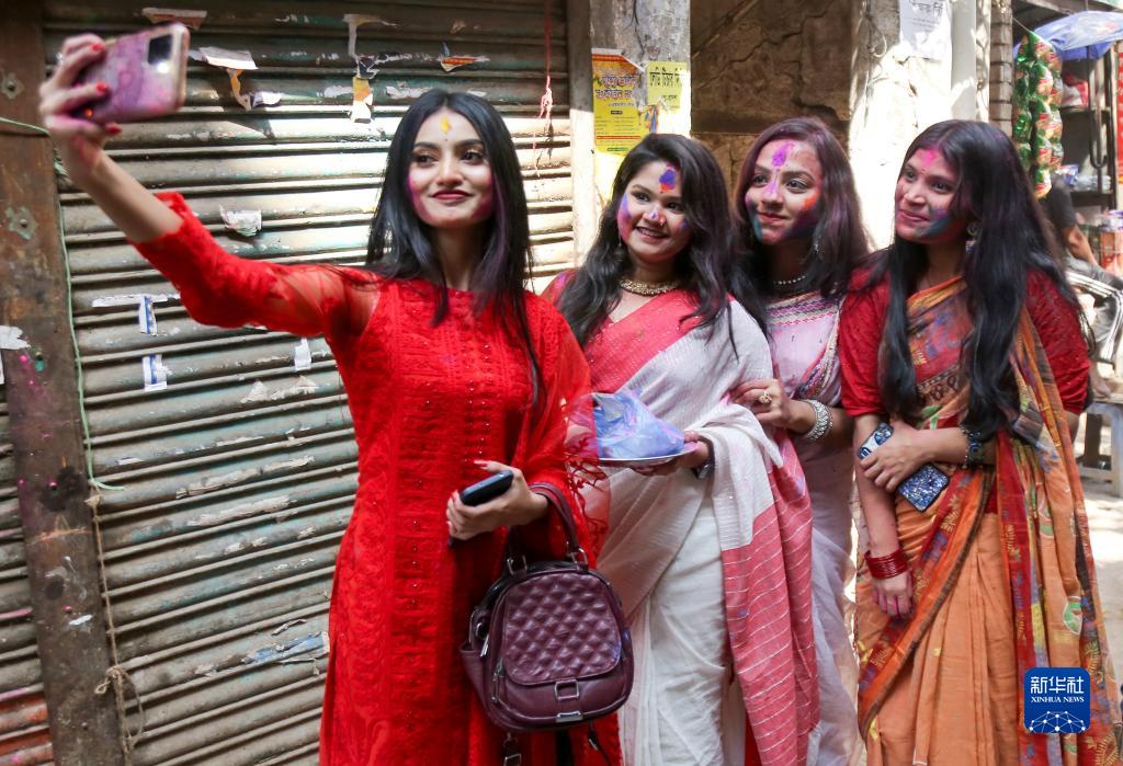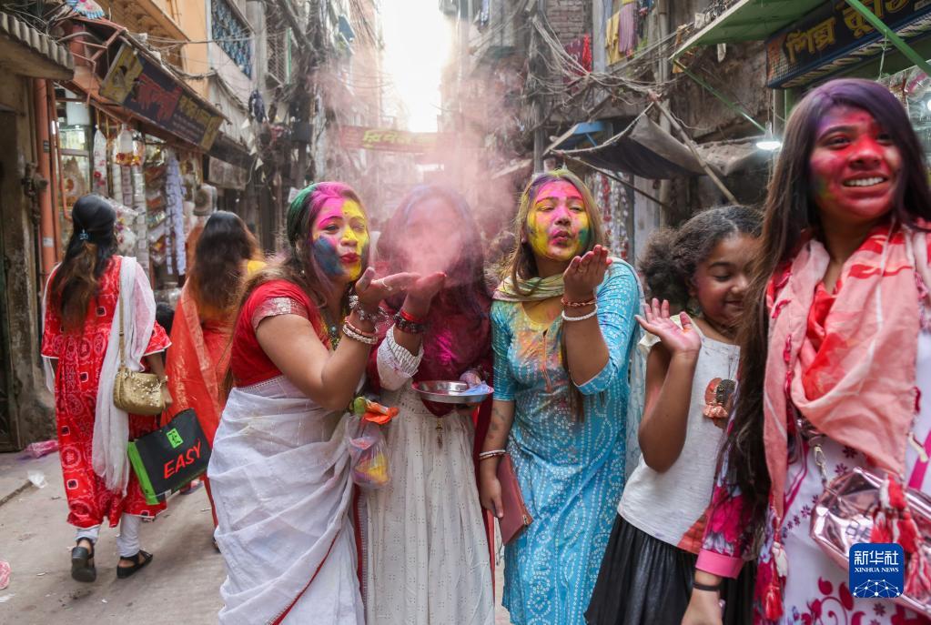 3月7日,人們?cè)诿霞永瓏?guó)達(dá)卡參加灑紅節(jié)慶?;顒?dòng)。