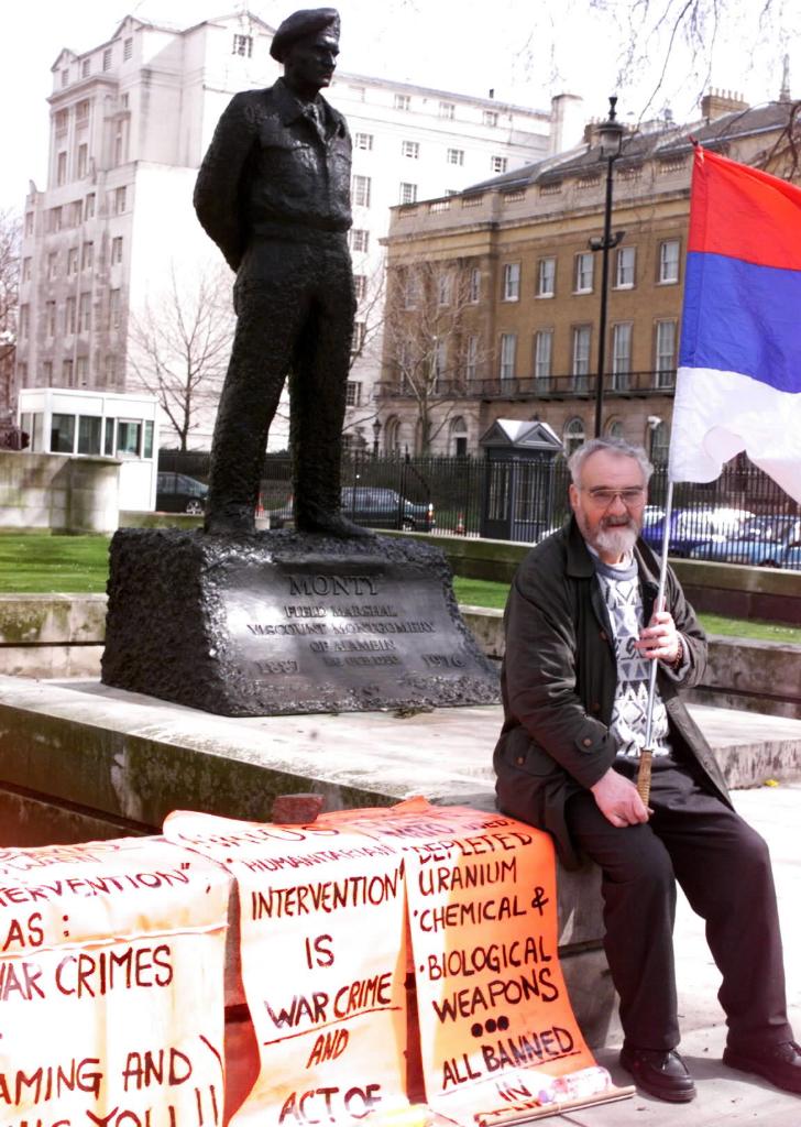 2001年4月11日,在英國倫敦首相府對面的二戰(zhàn)英軍元帥蒙哥馬利的青銅雕像前,一位南斯拉夫老人手舉南斯拉夫國旗,抗議以美國為首的北約轟炸南聯(lián)盟,并在轟炸中使用貧鈾彈,給當?shù)卦斐蓢乐丨h(huán)境污染。新華社記者侯少華攝