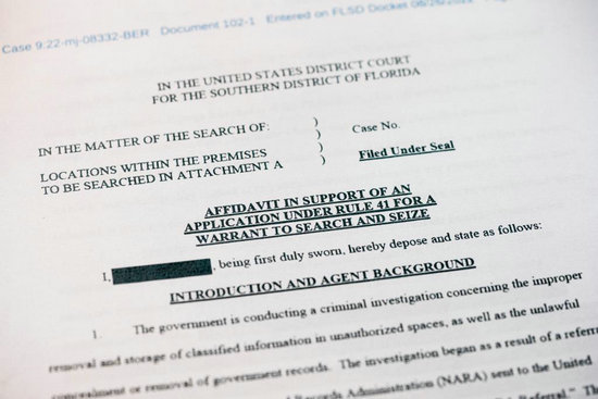 這是2022年8月26日拍攝的美國聯(lián)邦調查局申請搜查前總統(tǒng)特朗普住所海湖莊園時向法院提交書面證詞的部分內容。新華社記者劉杰攝