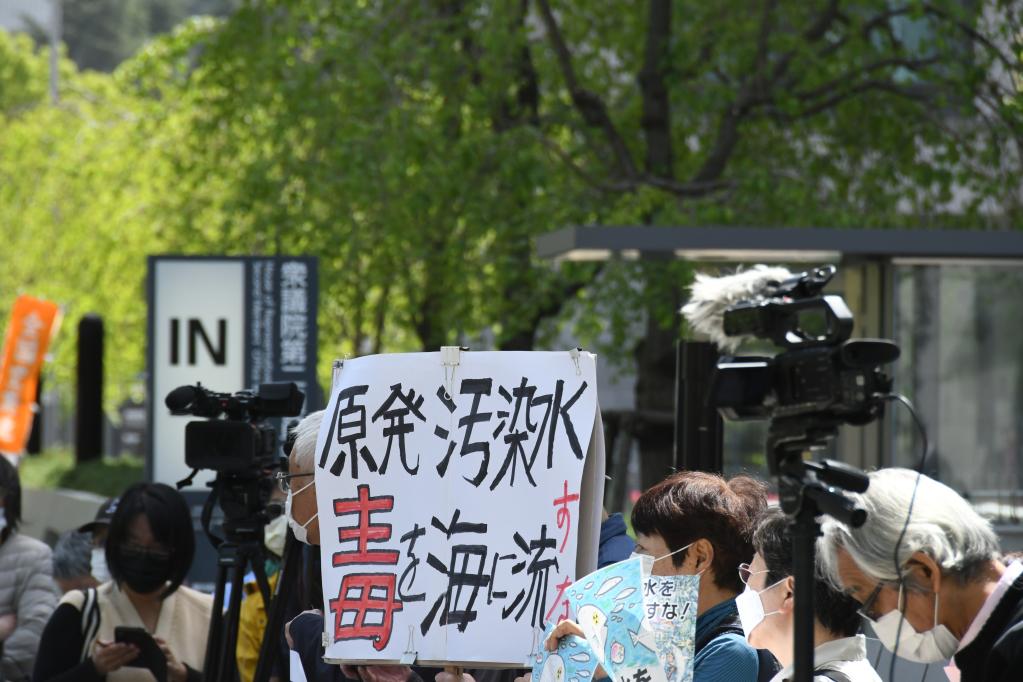 2023年4月13日,在日本東京,民眾手舉標(biāo)語在日本國會眾議院第二議員會館前參加集會,抗議日本政府推進(jìn)核污染水排海計劃。新華社記者 岳晨星 攝