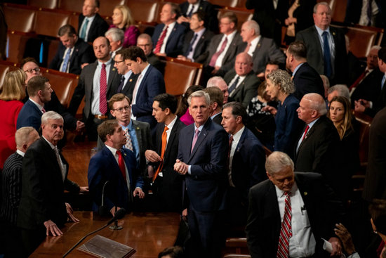 這是1月6日在美國(guó)華盛頓國(guó)會(huì)拍攝的凱文·麥卡錫(中)。新華社記者劉杰攝