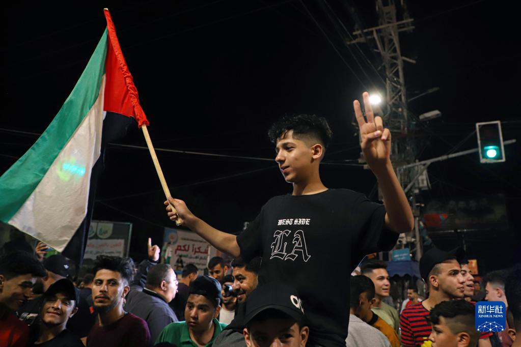 5月13日,巴勒斯坦人在加沙城街頭慶祝?;饏f(xié)議達成。新華社發(fā)(里澤克·阿卜杜勒賈瓦德攝)