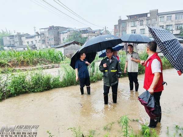 安州區(qū)黃土鎮(zhèn)組織黨員干部、志愿者,在興民社區(qū)查看汛情,巡查地質(zhì)災(zāi)害隱患點(diǎn)情況。(綿報(bào)融媒記者安崢攝)