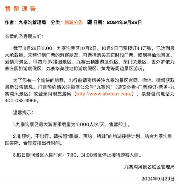 9月29日中午,九寨溝風景名勝區(qū)管理局就發(fā)布公告稱,截至9月29日11:00,九寨溝景區(qū)10月2日、10月3日門票預訂4.1萬張,已達到最大承載量。九寨溝風景名勝區(qū)管理局表示,九寨溝景區(qū)最大游客承載量為41000人次/天,售罄即止。