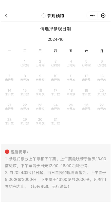 南京博物院國慶前6天的門票均已約完。南博工作人員介紹,國慶假期,南京博物院延時開放至21:00(20:00停止入館)。沒約到門票的,記得“蹲守”。國慶七天,南博每天9點、13點、17點將分別發(fā)放3000張、2000張、5000張當日門票。