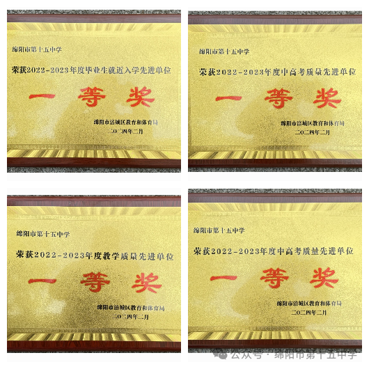 2024年2月19日,涪城區(qū)召開了2024年推進義務教育教學改革實驗區(qū)建設工作會,會上,表揚了2022-2023年度教育教學先進單位和先進個人,綿陽市第十五中學榮獲2022-2023年度“綜合績效考核先進單位一等獎”“中高考質(zhì)量先進單位一等獎”“教學質(zhì)量先進單位一等獎”“畢業(yè)生就近入學先進單位一等獎”殊榮。