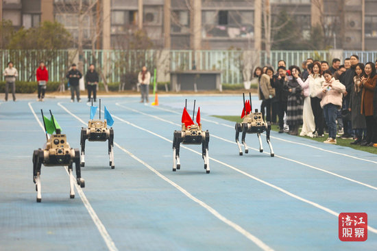 在人機(jī)共舞環(huán)節(jié),綿陽(yáng)實(shí)驗(yàn)高級(jí)中學(xué)健美操隊(duì)運(yùn)動(dòng)員與天鏈機(jī)器人T1默契配合,整齊劃一的動(dòng)作展現(xiàn)了人機(jī)融合的和諧美感。在百米比賽中,四只身披彩旗的四足機(jī)器人——兵裝自動(dòng)化所公司機(jī)器狼向著終點(diǎn)快速前進(jìn),小家伙們可愛(ài)的模樣和賣(mài)力奔跑的樣子讓現(xiàn)場(chǎng)觀眾驚嘆不已。