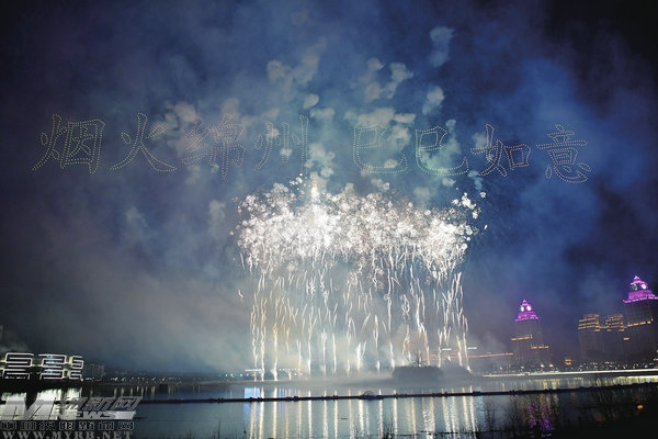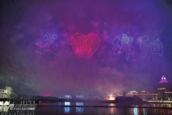 無人機集結(jié)金西湖畔上空,呈現(xiàn)出“煙火綿州巳巳如意”圖案。