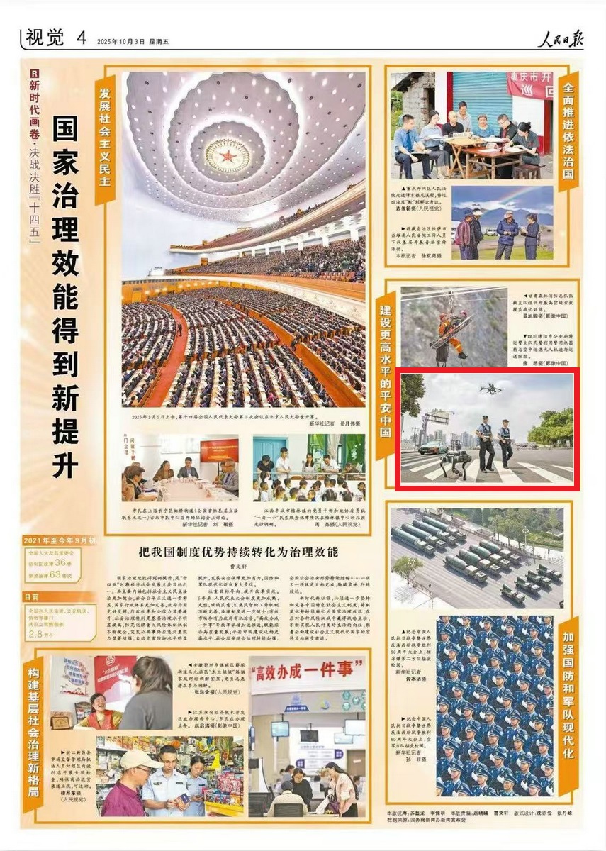 10月3日出版的《人民日報(bào)》刊發(fā)文章《國家治理效能得到新提升》,以圖片形式展現(xiàn)“十四五”時(shí)期我國社會主義民主法治更加健全,“高效辦成一件事”等改革舉措加速推進(jìn),平安中國建設(shè)邁向更高水平。其中,關(guān)注了四川綿陽利用警用機(jī)器狗與空中巡邏無人機(jī)進(jìn)行巡邏防控,助力建設(shè)更高水平的平安中國。全文如下: