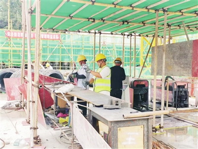 游仙區(qū)開元中學(xué)實施高中強基教育(教學(xué)綜合樓)項目現(xiàn)場,工人正在進行鋼筋加工工作。