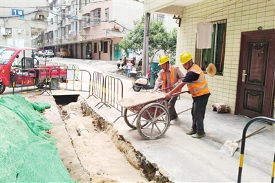 游仙區(qū)老舊小區(qū)居民自建房小區(qū)消防設(shè)施改造項目現(xiàn)場,工人正在進行管道的鋪設(shè)與填埋工作。