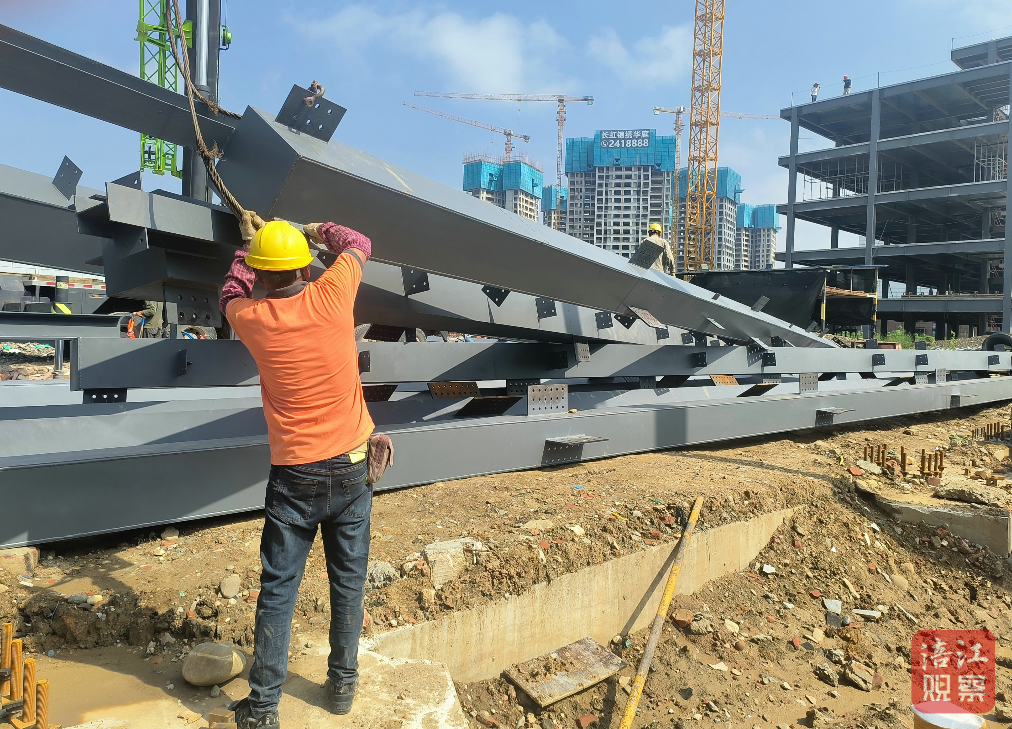 “目前,我們正在進行鋼構(gòu)的安裝,鋼柱和鋼梁的安裝都在同步推進,鋼梁部分已經(jīng)施工到三四層了。”施工現(xiàn)場負(fù)責(zé)人廖鋒指著正在“生長”的廠房向記者介紹,“右邊的綜合辦公樓主體樓板已經(jīng)完成,二樓以上準(zhǔn)備砌磚,底樓即將打墊層,我們正全力沖刺,確保今年12月底能夠如期完工。”