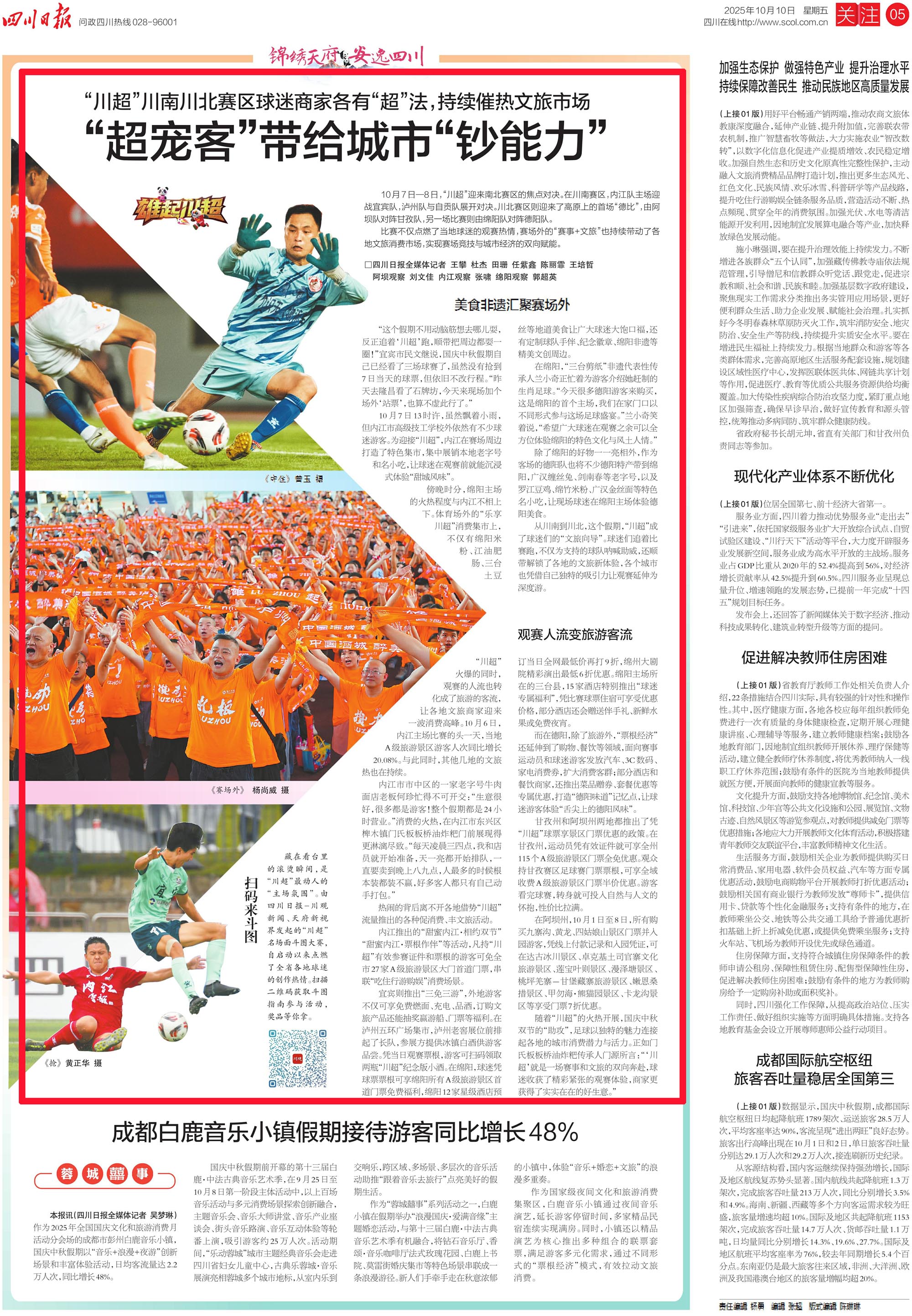 10月10日,《四川日?qǐng)?bào)》以《“川超”川南川北賽區(qū)球迷商家各有“超”法,持續(xù)催熱文旅市場(chǎng) “超寵客”帶給城市“鈔能力”》為題,報(bào)道了“川超”期間 ,足球以獨(dú)特的魅力連接起四川各地的城市消費(fèi)潛力與活力。其中特別關(guān)注了綿陽(yáng)主場(chǎng)通過(guò)“樂(lè)享川超”消費(fèi)集市將綿陽(yáng)地道美食及精美文創(chuàng)周邊等特色產(chǎn)品展示出來(lái),讓廣大球迷全方位體驗(yàn)綿陽(yáng)的特色文化與風(fēng)土人情,球迷還可憑球票票根享綿陽(yáng)所有A級(jí)旅游景區(qū)首道門(mén)票免費(fèi)福利、酒店折扣、演出折扣等。全文報(bào)道如下: