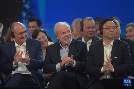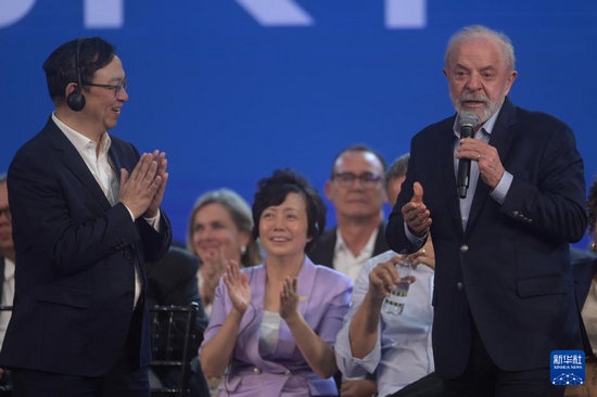 10月9日,巴西總統(tǒng)盧拉(右)與比亞迪董事長(zhǎng)兼總裁王傳福(左)在巴西東北部巴伊亞州卡馬薩里市出席慶祝儀式。新華社發(fā)(盧西奧·塔沃拉攝)