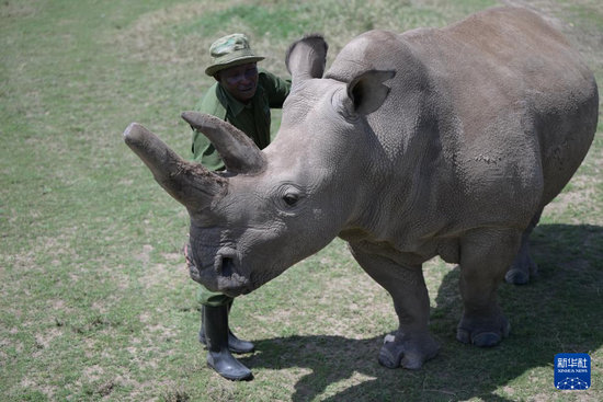 10月7日,在肯尼亞中部萊基皮亞郡奧爾佩杰塔自然保護區(qū),工作人員與雌性北方白犀牛“法圖”互動。